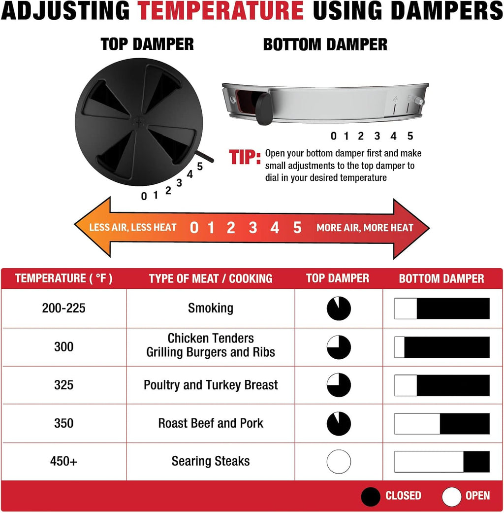 Dual Adjustable Dampers: Top and bottom dampers control airflow so you can fine-tune temperatures during cooking